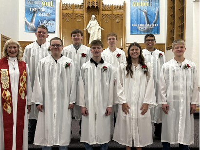 Left to right: Bishop Dee Pederson, Beckham Norby (Matt & Mandi Norby), Kingston Ryer (Danielle Ryer), Logan Esping, (Becky Esping, Nick & Nicole Esping), Parker Minnehan (Brad & Robyn Minnehan), Blayze Hulzebos (Mike Hulzebos & Jami Traen), Sydney Hennen (Andy & Emily Hennen), Colton Bitker (Russ & Jocelyn Bitker), Brycen Myhre (Cory & Leah Myhre)